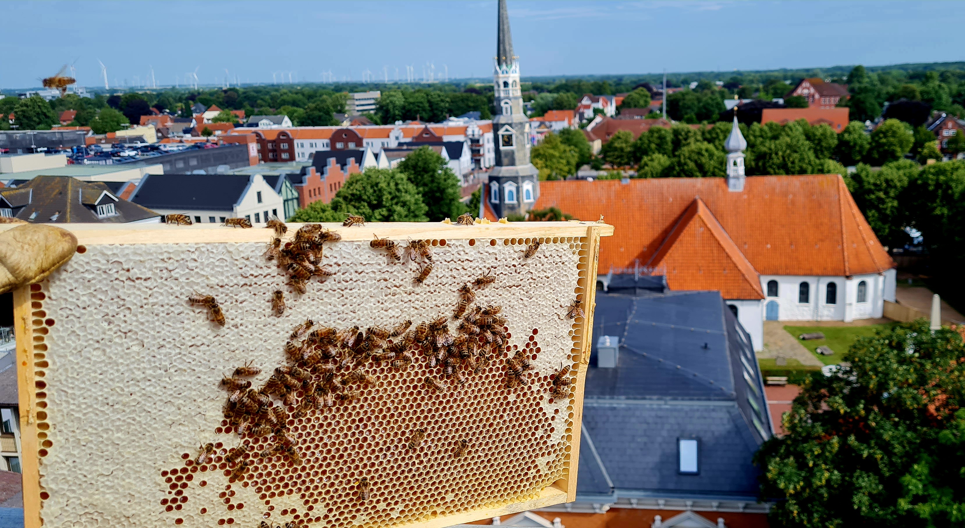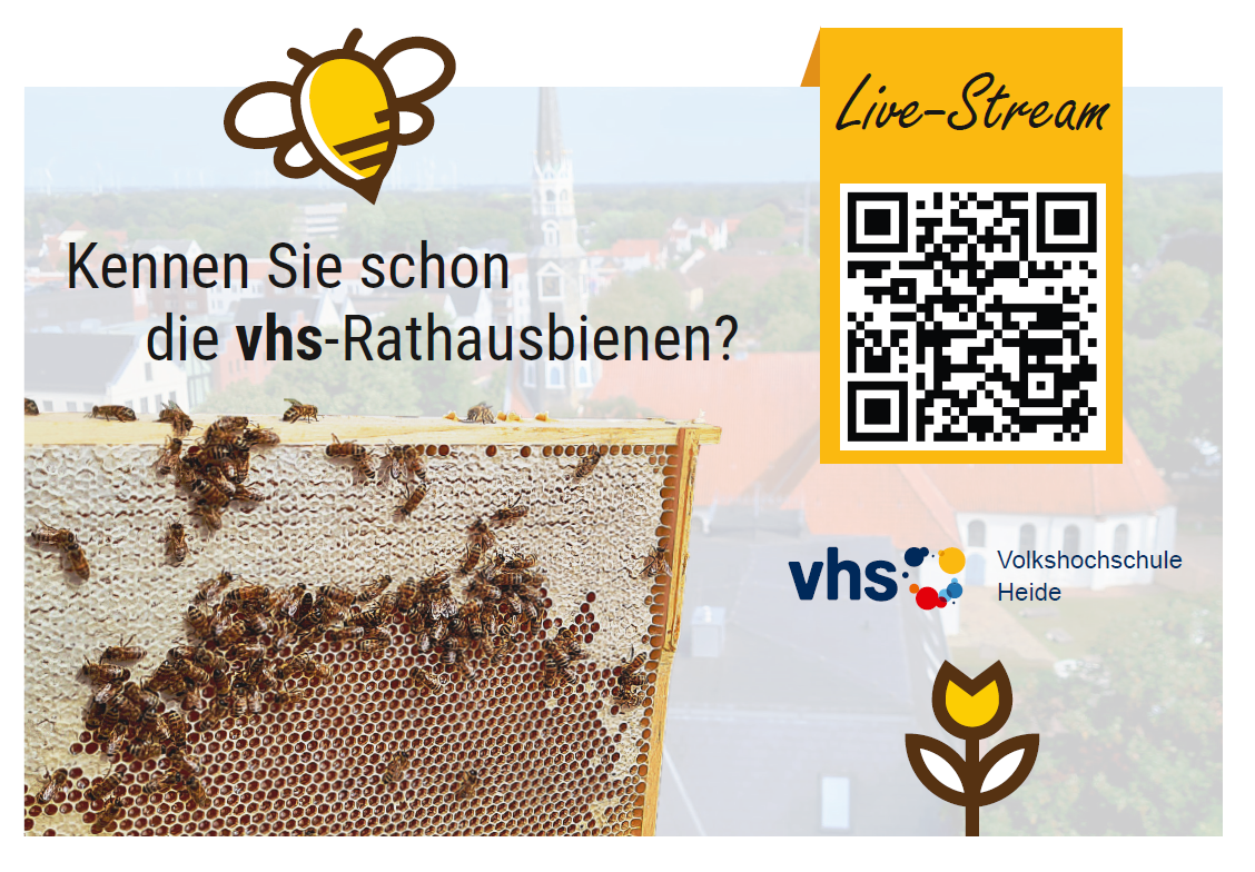 Deshalb hat die Volkshochschule Heide im Mai 2022 zwei Bienenvölker auf dem Heider Rathausdach angesiedelt und dort auch einen Livestream etabliert, über den Menschen die Bienen rund um die Uhr beobachten können: https://bienenkamera-vhs-heide.click2stream.com/